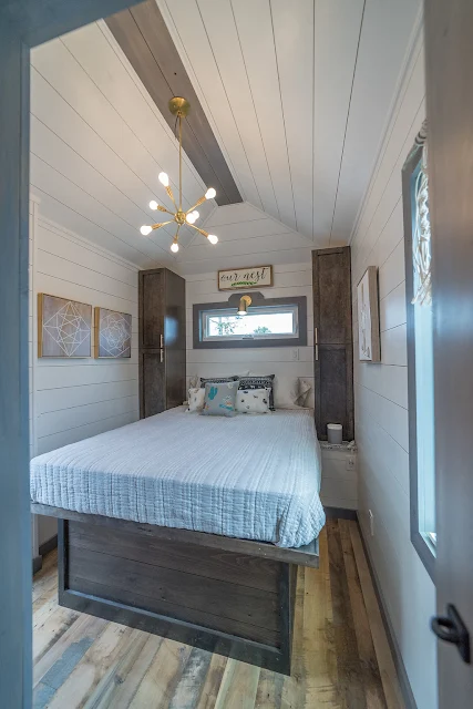When you walk into the home, the living/dining room and master bedroom are on the left, the kitchen is straight ahead and the bathroom is on the right near the stairs that lead up to the lofted bedroom.