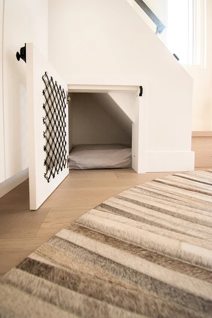 The ground floor unveils a bedroom of serene repose, offering ample space for a double-sized bed. Exposed beams create an ambiance of rustic charm, while built-in bedside shelving adds to the convenience and visual appeal. A small pet nook, ingeniously tucked beneath the staircase, is a testament to the thoughtful and innovative design that characterizes the Modern Tiny.