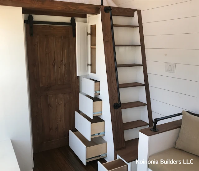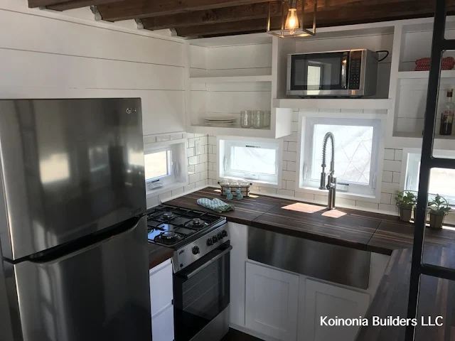 Designed and built by Koinonia Builders LLC of Austin, Texas,, the home measures 24' x 8.5' and has an interior size total of 265 sq ft. The exterior of the home features tongue and groove pine and cedar siding, and comes with closed cell foam insulation to keep the home snug. The interior of the home has a cozy design with pine walls, pine T&G ceiling and loft, and wood flooring.