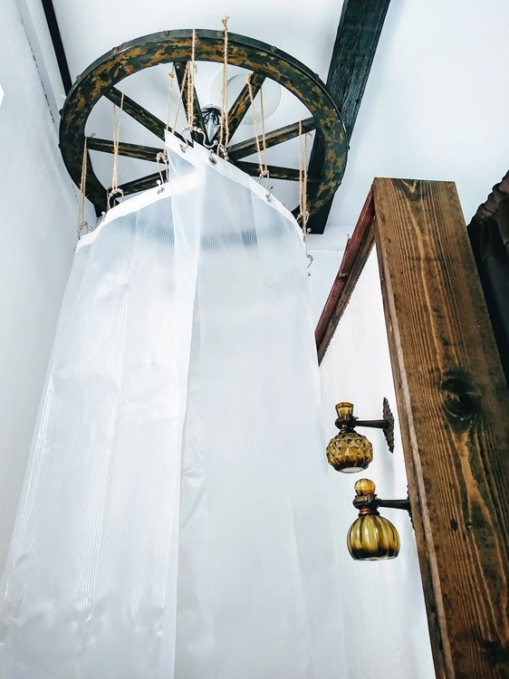 - Bathroom: rain barrel shower, toilet,