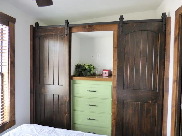 - Bedroom: enough room for a queen-sized bed, double closets with barn doors