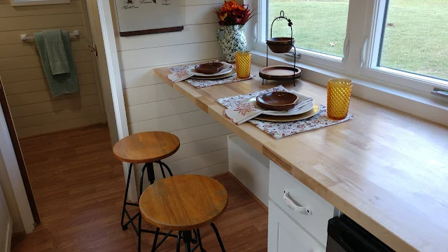- Kitchen: stainless steel appliances (mini fridge and oven), stainless steel sink, butcherblock countertops, dining space for two